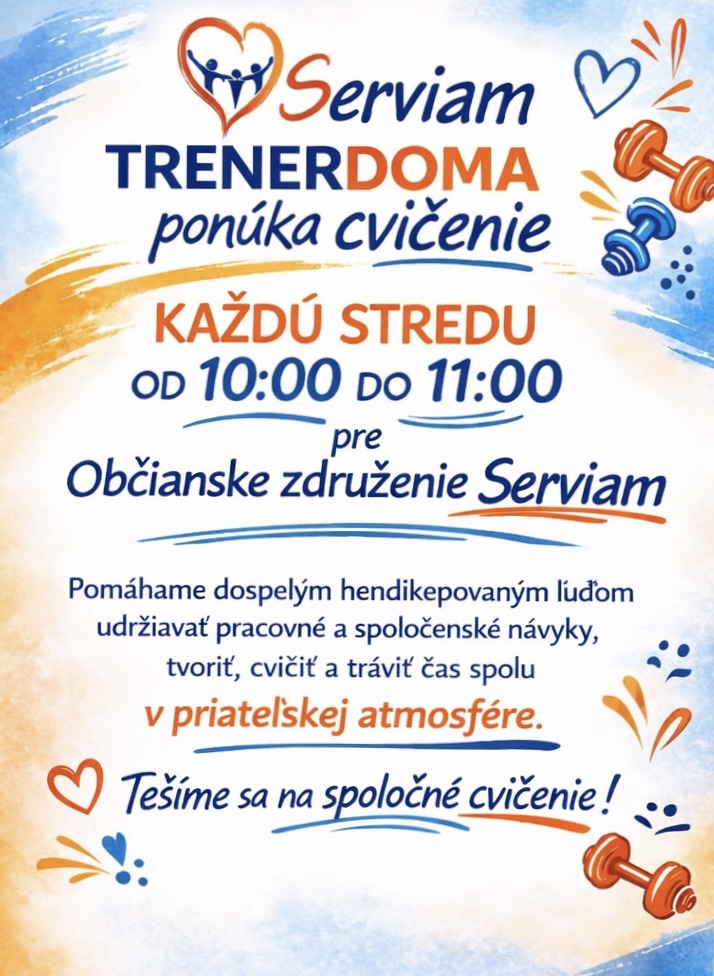 TRENERDOMA ponúka cvičenie každú stredu od 10:00 do 11:00 pre členov Občianskeho združenia Serviam z Piešťan a okolia.