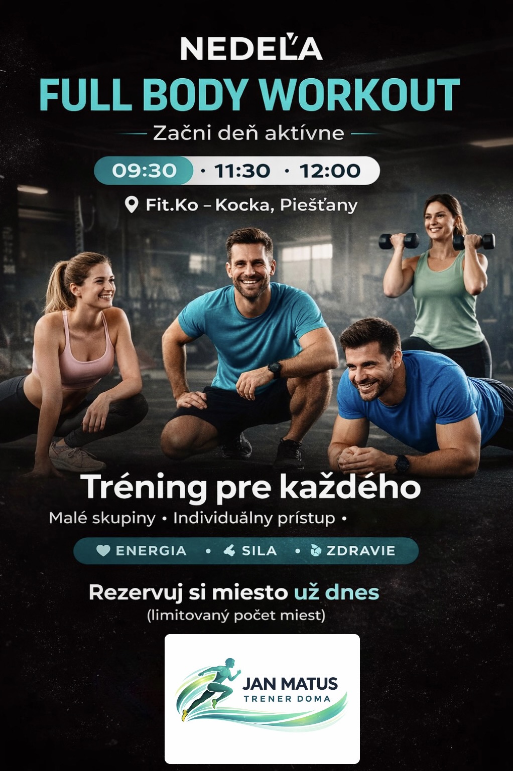 Dynamické cvičenie pre celé telo. Ideálne na rozhýbanie, posilnenie a dobrý pocit z pohybu. Tempo prispôsobené skupine, vhodné aj pre začiatočníkov.